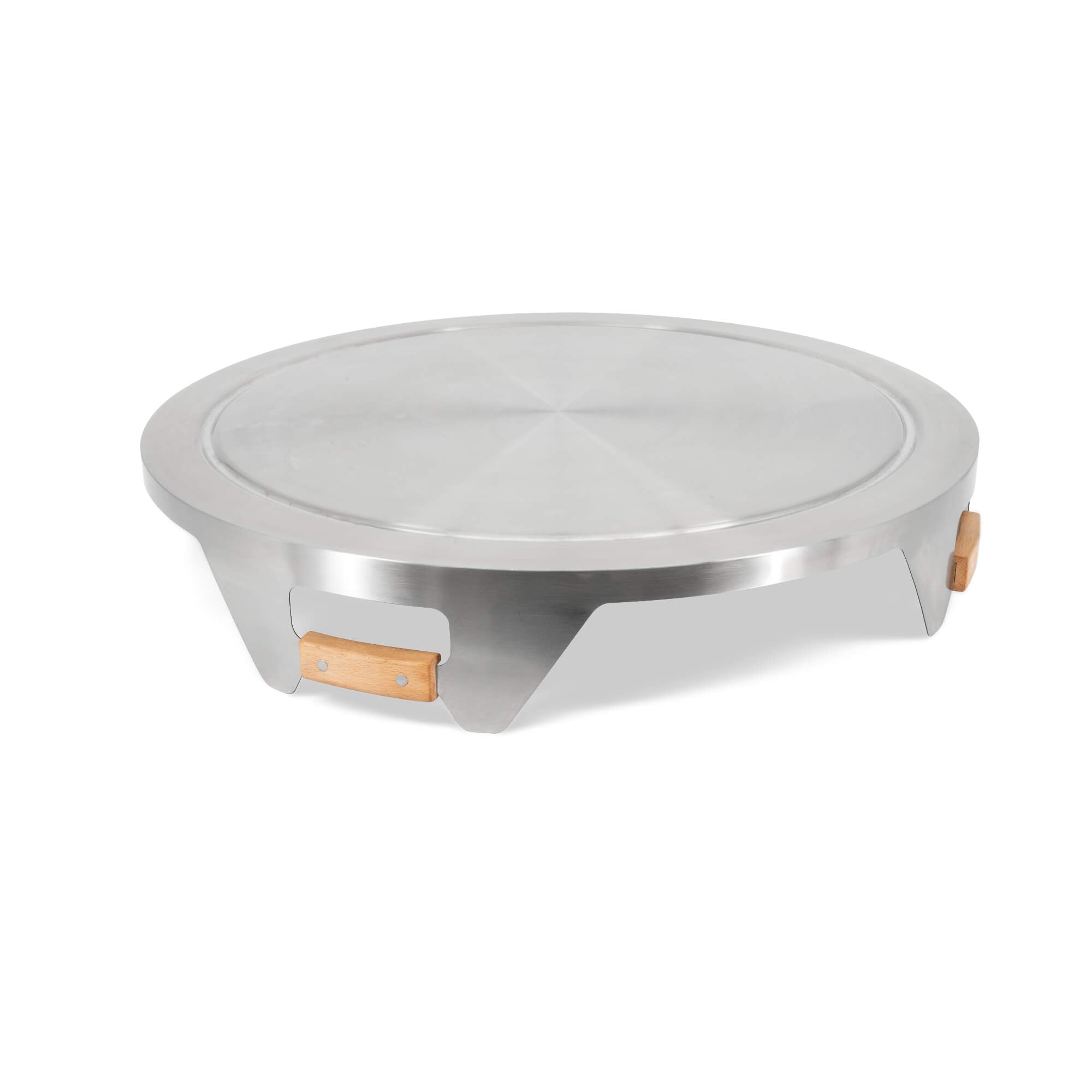 Der Tyropit-Deckel aus robustem Edelstahl ist die ideale Ergänzung für deine Feuerschale. Die massiven Buchenholzgriffe liegen angenehm in der Hand, während das hochwertige Design perfekt auf den Tyropit abgestimmt ist. Dank der cleveren Rillen auf Unterseite  zentriert sich der Deckel von selbst und sitzt stabil und passgenau.
